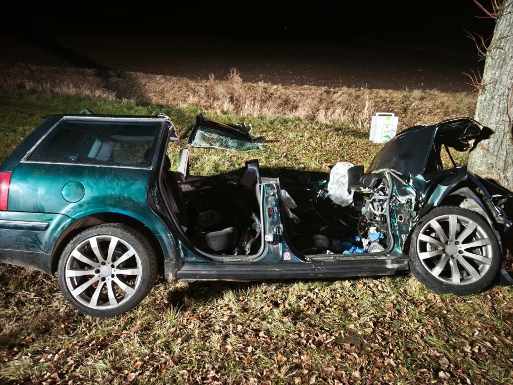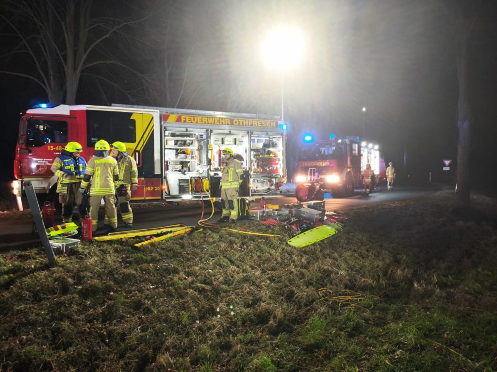 Aus ungeklärter Ursache kollidierte ein PKW frontal mit einem Baum. Bei Ankunft der ersten Kräfte waren zwei Insassen im inneren eingeschlossen. Während der Erkundung und öffnen der Beifahrertür konnte eine Person selbstständig das Fahrzeug verlassen und wurde durch ausgebildetes Rettungsdienstpersonal der Feuerwehr erstversorgt, eine zweite war schwer eingeklemmt. Nach Rücksprache mit dem Notarzt wurde der Patient nach Stabilisierung und Entfernung des Daches über die Fahrerseite gerettet. Da nicht sicher war ob ein dritter Insasse im Fahrzeug war, wurde das Umfeld der Einsatzstelle mittels mehreren Wärmebildkameras abgesucht und ausgeleuchtet, es konnte keine weitere Person gefunden werden. Beide Patienten kamen schwerverletzt in umliegende Krankenhäuser. Die Feuerwehr Othfresen unterstützte die Liebenburger Kräfte bei den Rettungsarbeiten und stellte den inneren Retter. Die Döhrener Kameraden sicherten die Einsatzstelle ab. Nach etwa 90 Minuten konnten die Feuerwehren die Einsatzstelle verlassen.