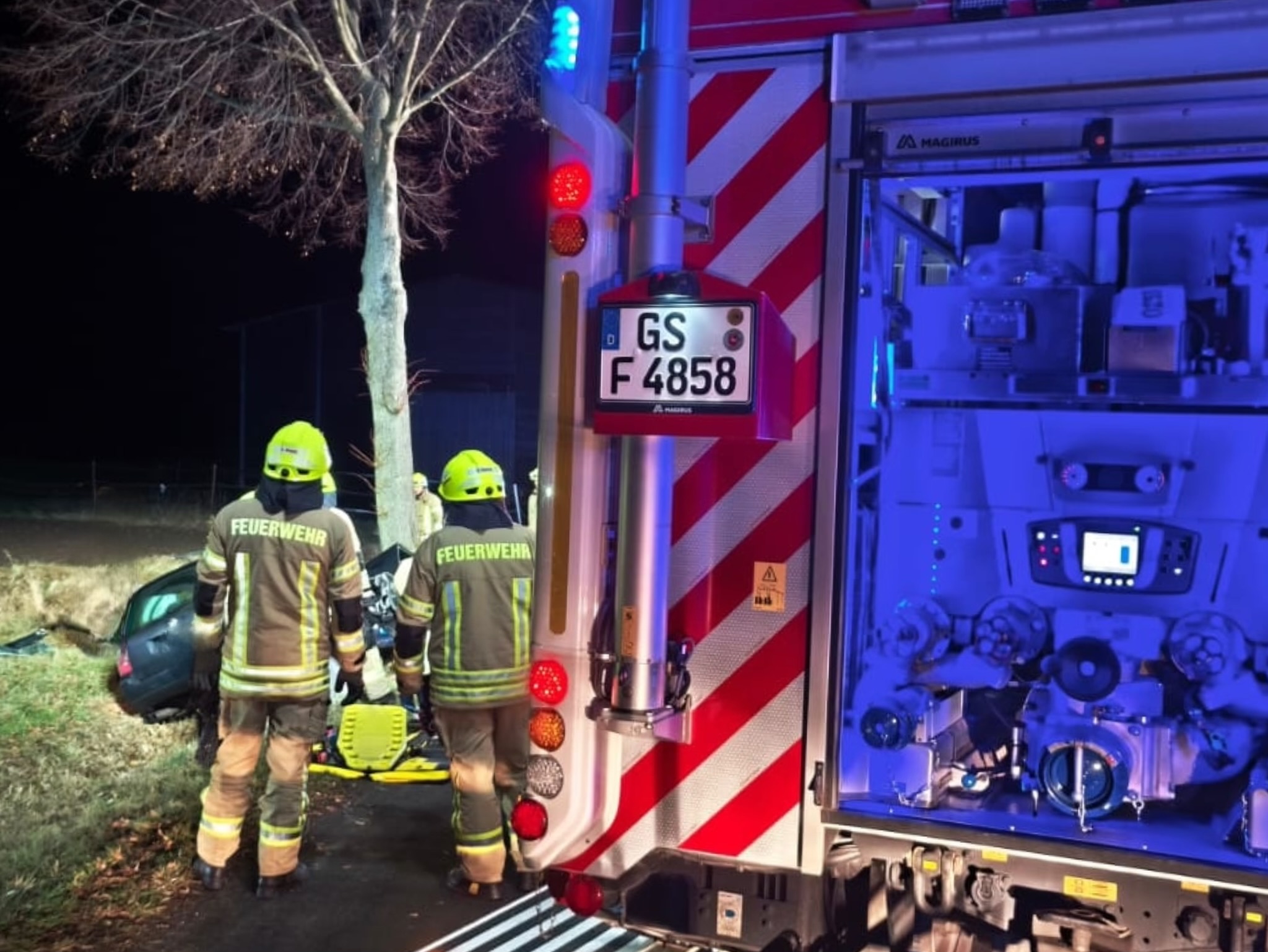 Aus ungeklärter Ursache kollidierte ein PKW frontal mit einem Baum. Bei Ankunft der ersten Kräfte waren zwei Insassen im inneren eingeschlossen. Während der Erkundung und öffnen der Beifahrertür konnte eine Person selbstständig das Fahrzeug verlassen und wurde durch ausgebildetes Rettungsdienstpersonal der Feuerwehr erstversorgt, eine zweite war schwer eingeklemmt. Nach Rücksprache mit dem Notarzt wurde der Patient nach Stabilisierung und Entfernung des Daches über die Fahrerseite gerettet. Da nicht sicher war ob ein dritter Insasse im Fahrzeug war, wurde das Umfeld der Einsatzstelle mittels mehreren Wärmebildkameras abgesucht und ausgeleuchtet, es konnte keine weitere Person gefunden werden. Beide Patienten kamen schwerverletzt in umliegende Krankenhäuser. Die Feuerwehr Othfresen unterstützte die Liebenburger Kräfte bei den Rettungsarbeiten und stellte den inneren Retter. Die Döhrener Kameraden sicherten die Einsatzstelle ab. Nach etwa 90 Minuten konnten die Feuerwehren die Einsatzstelle verlassen.